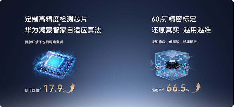 高精度檢測芯片搭載華為鴻蒙智家自適應算法,能對每一路傳感器信號做實時補償與融合處理,保障傳感器即使處于復雜環境下也能穩定探測,抗干擾能力提升17.9%*。
