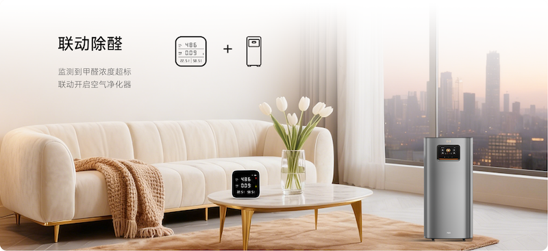聯動除醛:當豪恩空氣質量檢測儀監測到甲醛超標時,自動聯動空氣凈化器進行凈化。新裝修用戶無需頻繁往返開窗,省時省心。